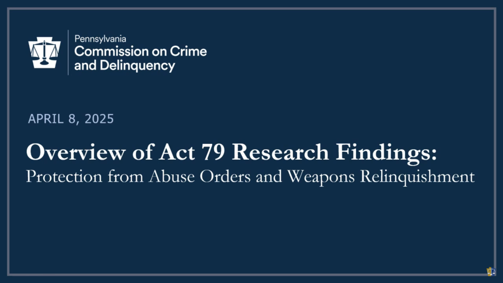Overview of Act 79 Research Findings: Protection from Abuse Orders and Weapons Relinquishment Elizabeth Van Nostrand and partners from IUP and PCADV presented a webinar on April 8, 2025. A link to the recording can be found at: Act 79 Findings & Impact: 6 Years Later | Webinar Recording