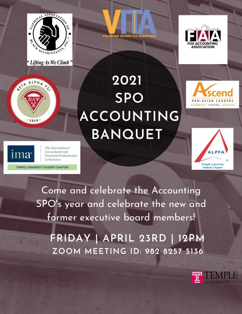 Weekly meetings hosted with Fox Accounting Association, Ascend, Institute Management of Accountants, and National Association of Black Accountants feature speakers from the Philadelphia area firms. Presentation topics range from career development to issues in the industry to technical subjects.