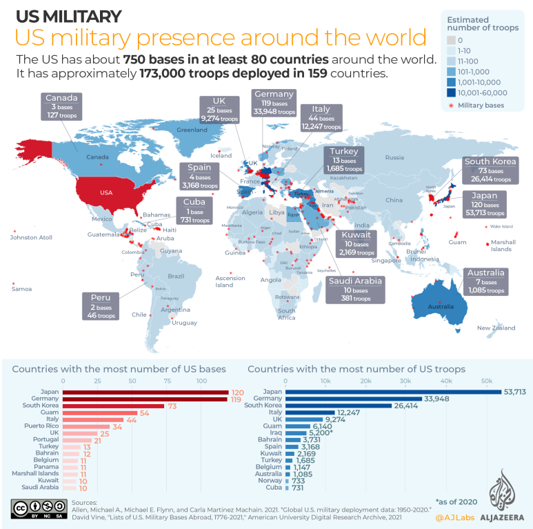 The United States currently operates hundreds, possibly thousands, of military bases, with some hundreds of thousands of personnel, in foreign nations (Nyden; Ramsey). Though in an age after The Age of Imperialism, we still see a number of colonialist ideals exhibited in the current U.S. military state abroad. From the Americas, throughout Africa, all the way to Asia and elsewhere, the U.S. military state has expanded its scope and power. This has led to a lacking sense of sovereignty and self-determination among many populations forced to live around these bases. With puppet governments, U.S. influence in local politics, and violence carried out against local populations (Nyden), these bases make their case as modern instruments of colonial oppression.
