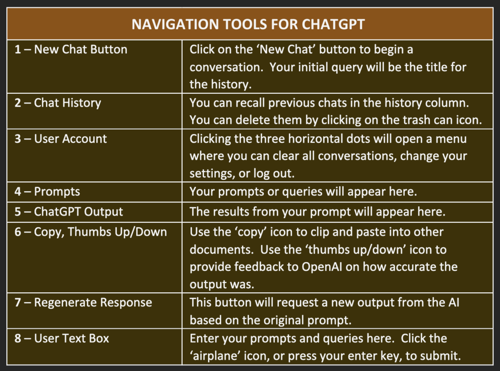 Step 3: Use the text entry box (area 8, “Send a message…”) at the bottom of the screen to type a prompt. This can be a question or a specific request. Press the paper airplane icon to submit.  We have provided a video example, Prompting In ChatGPT, showing how to do this.