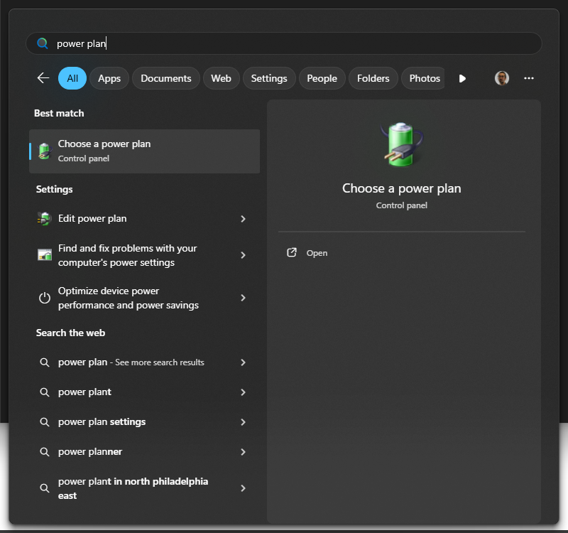 - In the Windows search bar, type “power plan”