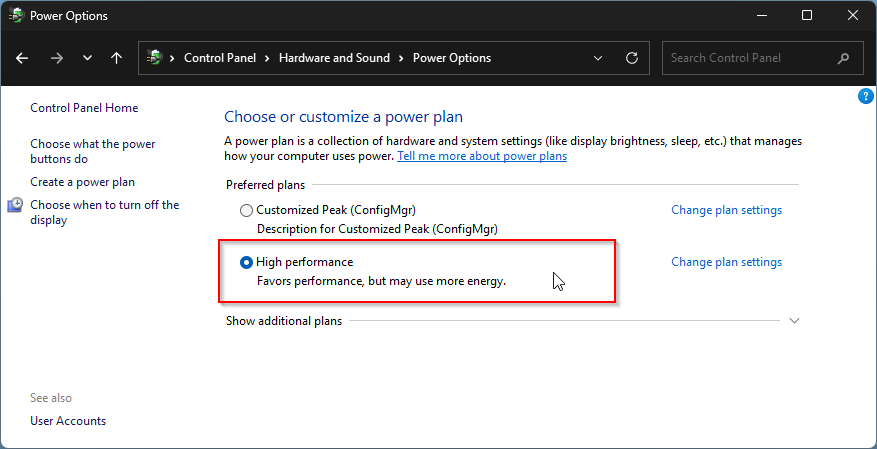 - Change the preferred plan to “High Performance”