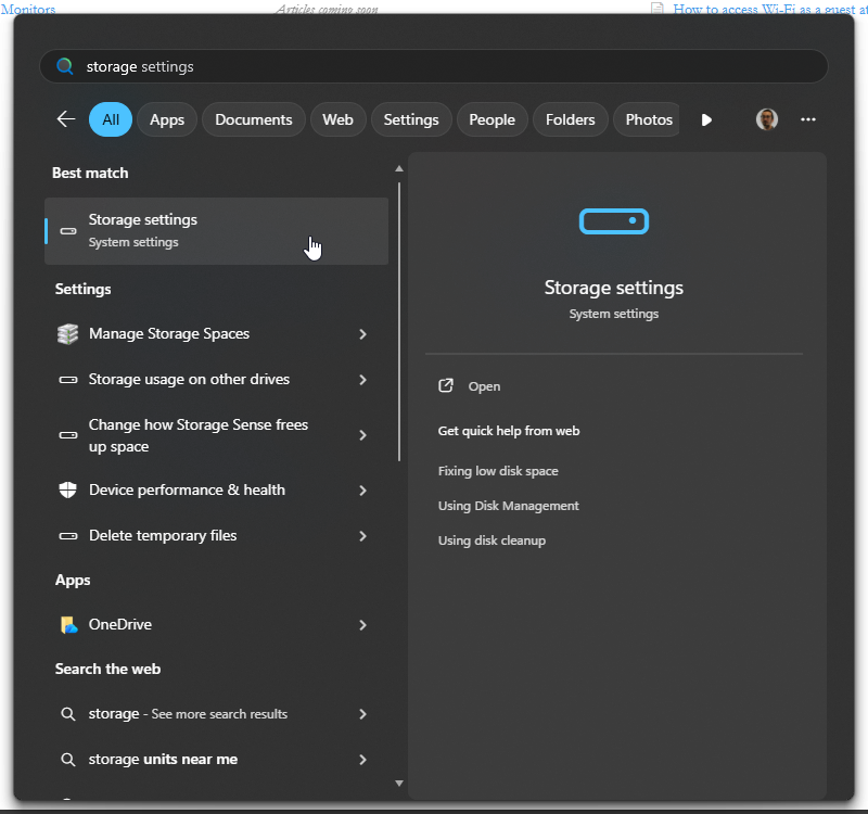 - In the Windows search bar, type “Storage settings”