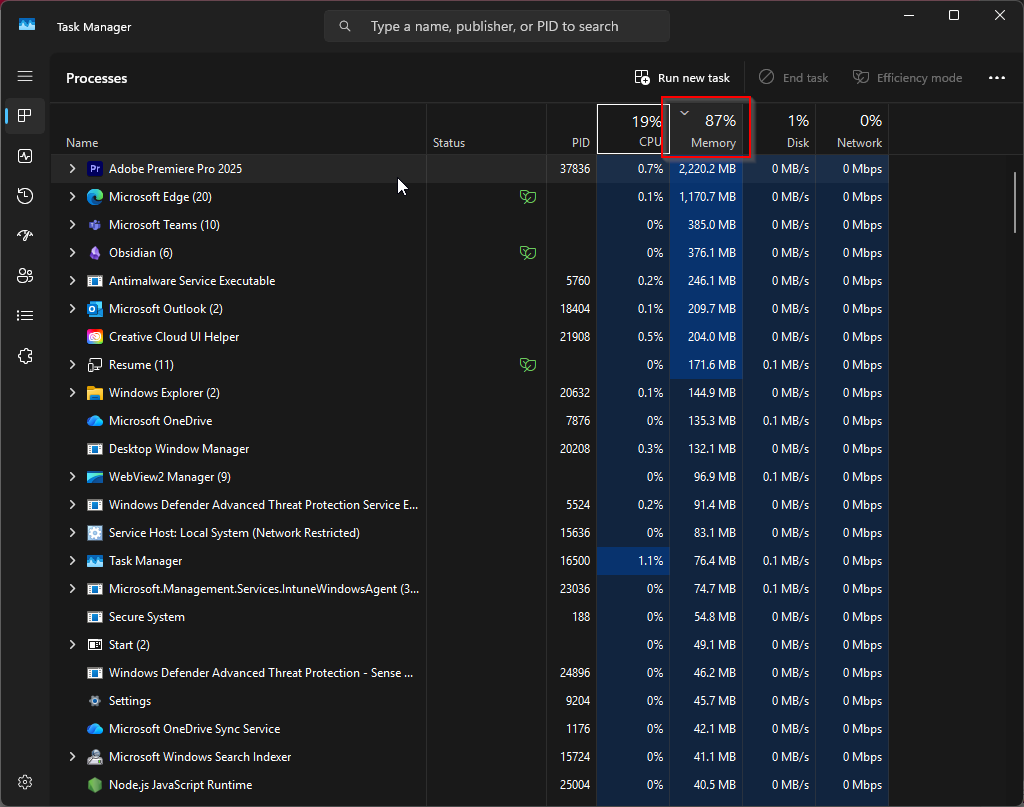 - Click on the “Memory” column header to by how much of your device’s memory each process is using.