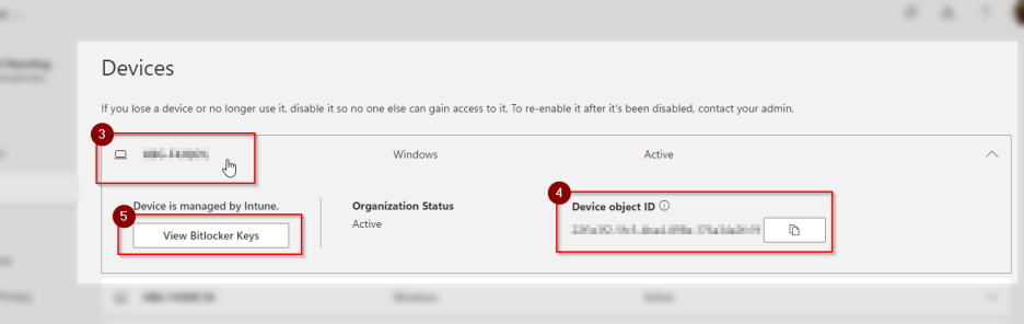 - Confirm that the “Device object ID” matches the “Recovery key ID (to identify your key)” on the BitLocker Recovery Screen