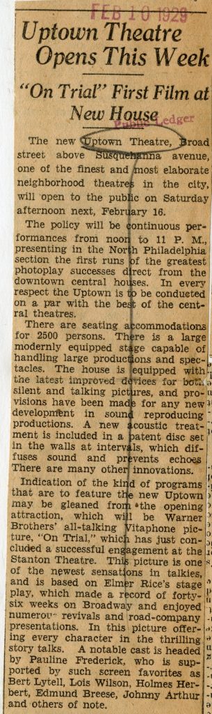 The Uptown Theater, located at 2240 North Broad Street, opened on February 16, 1929. The five-story Art Deco theater was designed by the noted architectural firm Magaziner, Eberhard and Harris, and featured a terracotta façade, high ceilings, stain-glass windows, plush carpets and velvet seats. The theater was originally owned by the Stanley Theater/Warner Brothers chain, and movie-goers included wealthy industrialists and working-class immigrant families that resided along the bustling North Broad Street corridor.