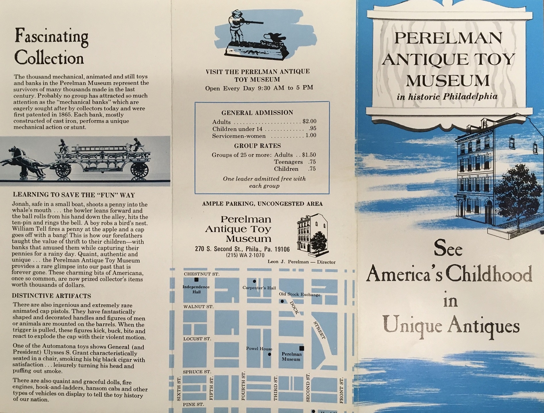 Philadelphia paper manufacturer, Leon J. Perelman started collecting mechanical penny banks in 1958 after visiting a hobby show in Fort Madison, Iowa. Eventually, he amassed over 3,000 banks, tin and cast iron toys produced from the late 1860s through the 1910s. First patented in 1865, mechanical penny banks were designed to encourage children to save money by providing entertainment and amusement with one or more mechanical actions when a penny was deposited in the slot for safekeeping. Perelman’s collection was considered the largest private collection of antique toys in the world by some estimates. In addition to penny banks, Perelman’s collection also featured cap pistols, dolls, cast iron vehicles such as fire engines and stage coaches, and a reference library containing patent papers on mechanical banks. Although there is no mention in the official collection guide, the museum also contained antique glass and agate marbles.