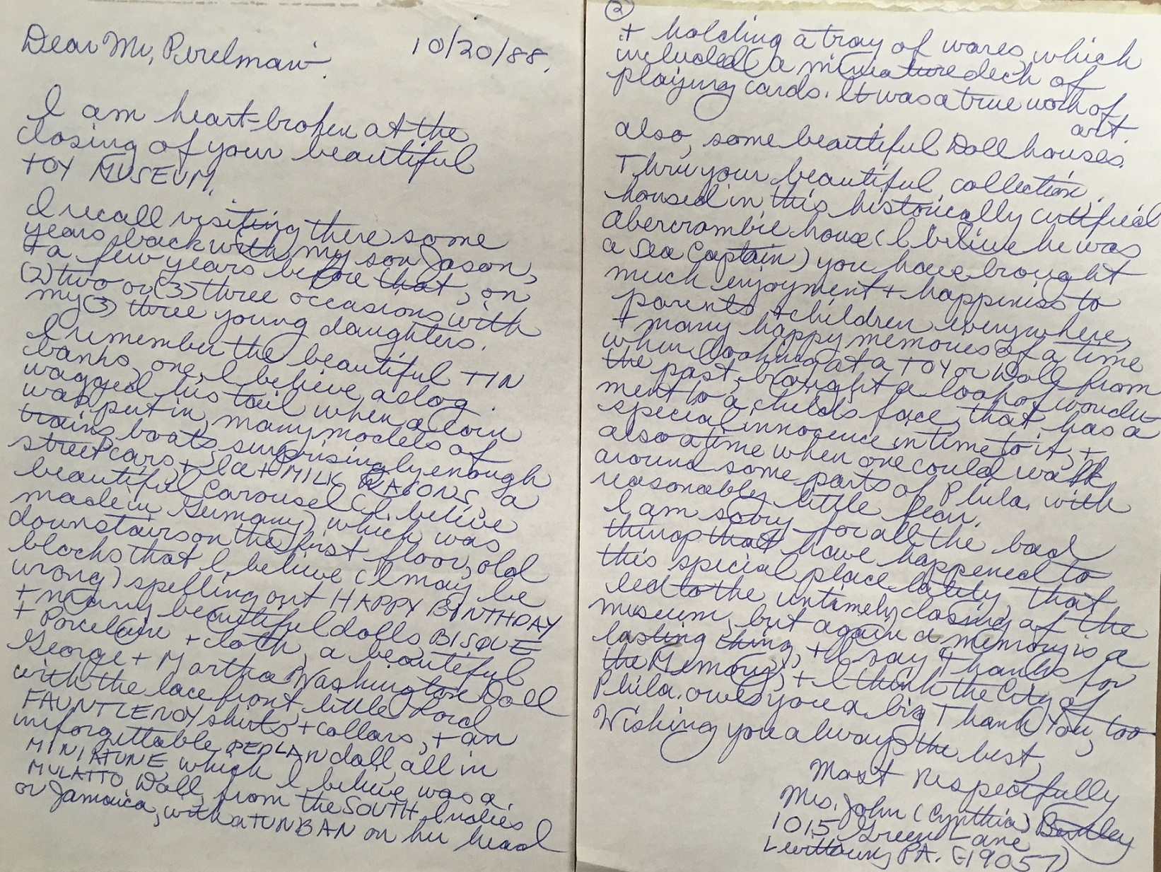 For nearly twenty years, the Perelman Antique Toy Museum amused children and adults alike, but on August 5, 1988, Perelman lost his marbles in a smash and grab job that would close the museum forever. Although the local press did not report on the museum heist in the days immediately following the robbery, Maine Antique Digest was able to interview museum curator, Michael Tritz about the day’s events. According to Tritz, he was preparing to open the museum for the day, when the thieves entered the museum, bound and gagged him, and forced him into a restroom. He recounted “I heard one of them upstairs hammering at the display cases. I thought he was getting into all of them . . . but all he could break was the case with marbles in it on the third floor.” The 5/8″ thick bulletproof glass foiled their attempt to steal any of Perelman’s coveted mechanical penny banks. Tritz estimated one of the thieves spent about 45 minutes trying to break the display cases while the other watched the door. Perelman shuttered the museum the day after the robbery. It wasn’t until The Philadelphia Inquirer published a piece on August 31, declaring the “Toy museum is no more,” that antique toy enthusiasts and museum goers learned about the robbery. There is no evidence the thieves were ever caught or the marbles recovered. Within a few weeks, Perelman sold the estimated $3 million toy collection to New York-based art and toy dealer, Alexander Acevedo who dissolved the collection in a series of invitation-only sales to collectors and dealers.