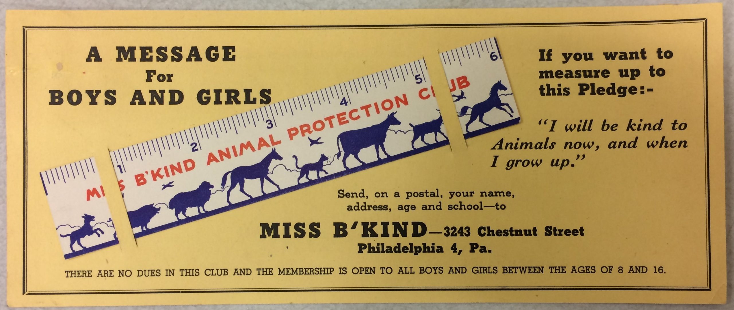 Halvey taught humane education in private and parochial schools throughout the Philadelphia region as part of the AAVS’ effort to combat the use of animals in scientific experimentation. The club also hosted meetings for children ages 8 to 16 at the AAVS headquarters every other Saturday and provided a correspondence membership for children across the U.S, Canada, England, Ireland, and Australia. Club members pledged “I will be kind to animals now and when I grow up.” Halvey promoted the club through lectures and a radio show series on WPEN called “Dogs I Know About.” In 1931, Halvey received a humanitarian prize from the Geneva International Bureau for the Protection of Animals for her humane education work related to the Miss B’Kind Club.