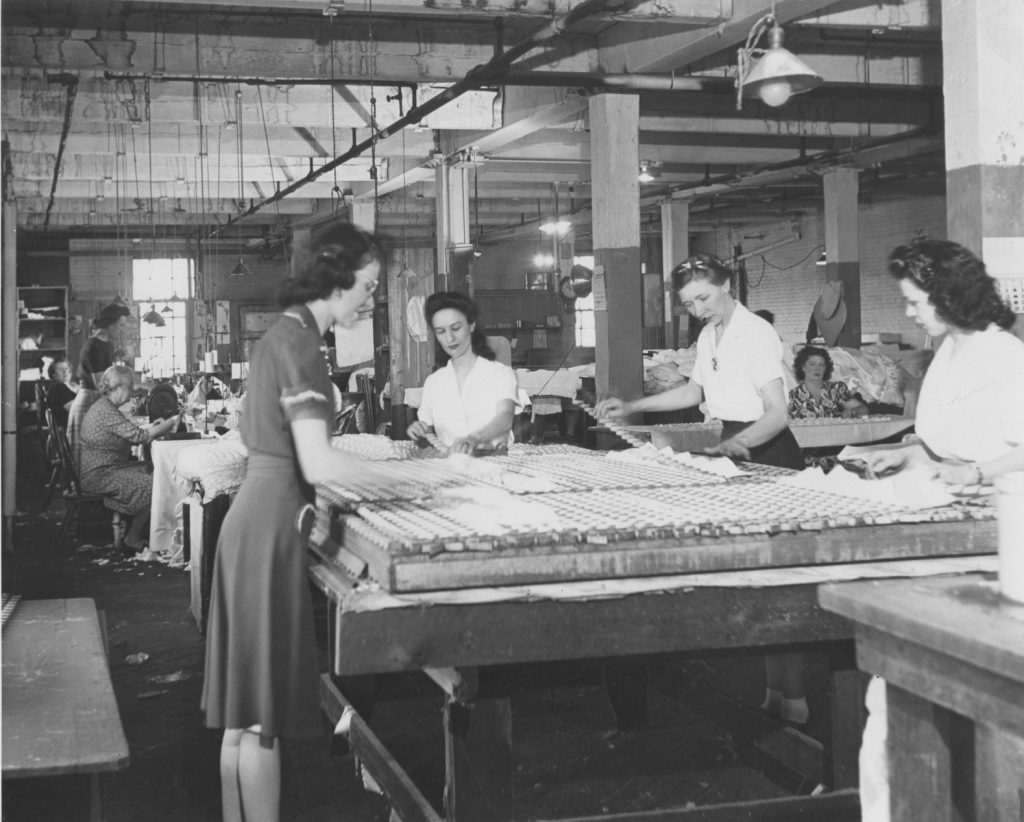 UIU workers making casket interiors, 1950s, UIU Photograph Collection