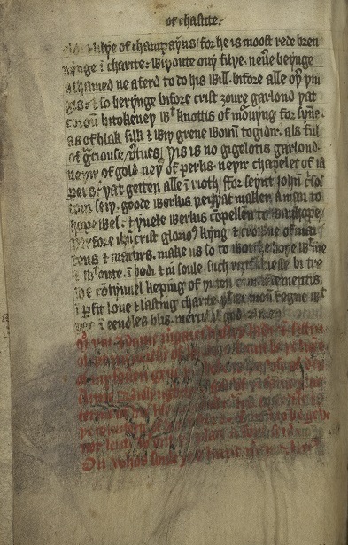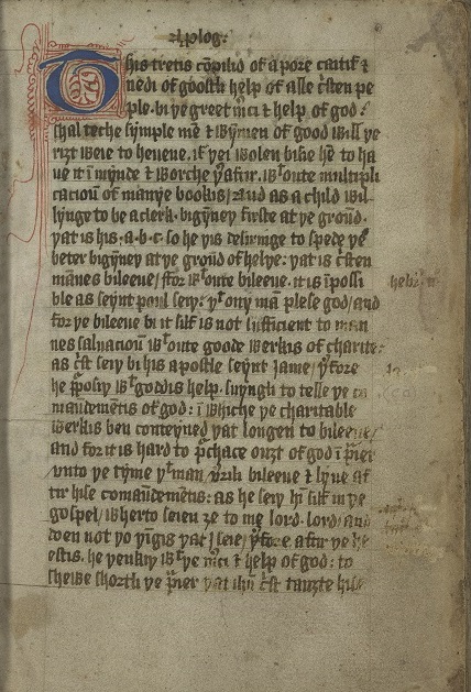 One interesting volume in the collection is a manuscript of the “Pore Caitif,” a late 14th and 15th century devotional text consisting of tracts intended for home use by the laity. The compilation of this handbook for religious instruction is most frequently attributed to English reformer John Wycliffe (1330 – 1384), and it contains approximately fourteen tracts intended to teach the reader about the Ten Commandments, the Paternoster, the Creed, and other basic aspects of Christianity. The number of Pore Caitif manuscripts in existence–more than fifty–demonstrates that this text was extremely popular during this time period.