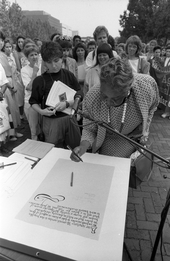 Since the mid-1970s, WOAR has participated in a national network of local rape crisis centers and maintained membership in national and state organizations that guide the movement to end sexual assault. In 1989, along with the Pennsylvania Coalition Against Rape (PCAR), it was host to the eleventh annual National Coalition Against Sexual Assault (NCASA) Conference. With its theme, Diversity, Strength and Freedom: A New Declaration of Independence, the conference included several days of workshops, panel presentations, and events related to rape and sexual assault and sought to lift up the voices and experiences of women of color in particular. The conference opened on July 18 with the Women of Color Institute-–a full day program for, by, and about women of color, with Angela Davis delivering the keynote address. The next day, 150 women gathered in front of Independence Hall to sign a New Declaration of Independence. This document addressed the people and freedoms neglected by the original Declaration, citing racism and sexism to be the real lasting sources of tyranny and oppression in American society. It called for collective action to combat those forces.