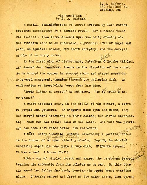 The Weinbaum, Eshbach, and Zagat collections all contain a mix of manuscripts of published and unpublished short stories and novels, and correspondence with editors, agents, publishers, and authors. Much of the material is from the 1930s and 1940s, and provides a glimpse into that era of science fiction writing and publishing, particular in the pulp magazine area.
