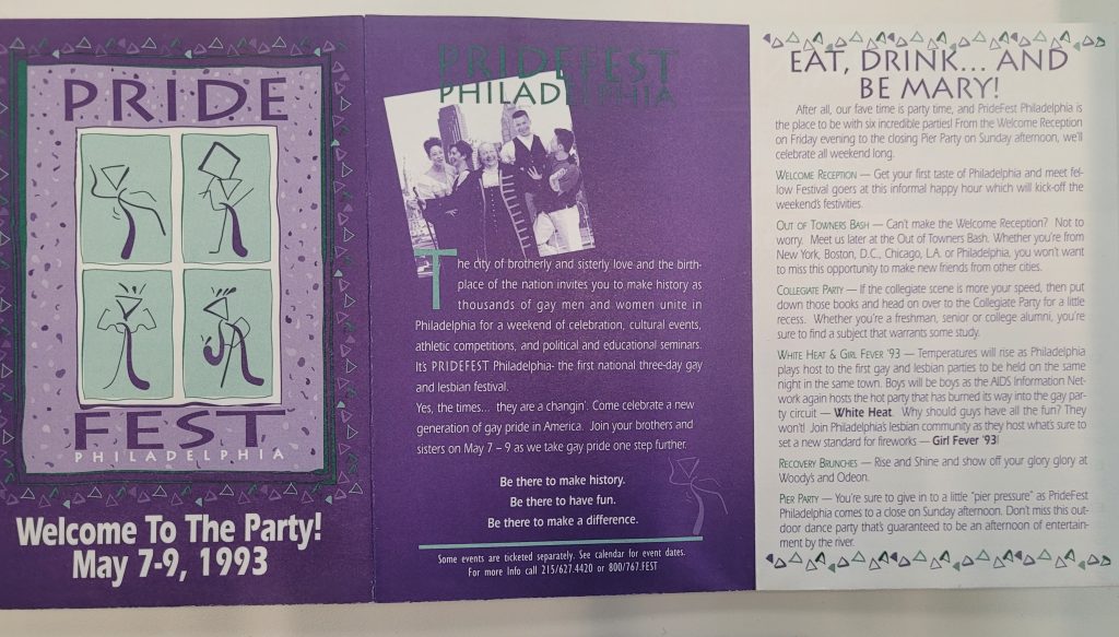 The Special Collections Research Center commemorates Gay Pride Month 2022 with a pop-up exhibit in our reading room featuring selections from collections that focus on the LGBTQ+ community and their coverage of pride events around the city through the years. The exhibit includes material from the AIDS Library (Philadelphia, Pa.) Records, the Philadelphia Lesbian and Gay Task Force Records, the Philadelphia Gay News, and the Scott Wilds Papers.