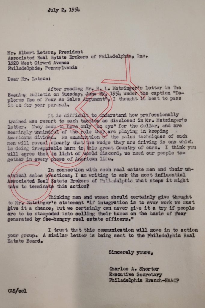 The NAACP, Philadelphia Branch, under the leadership of Charles A. Shorter, also made important strides in extending civil rights during this period. Shorter led successful efforts to force department stores to hire black clerks, end segregated seating in Philadelphia theaters, and integrate the Philadelphia Real Estate Board and the Pennsylvania Parole Board, among other accomplishments in this era. In 1953, the Philadelphia Branch was awarded the Thalheimer Award, the NAACP’s top award given to branches for outstanding achievements.