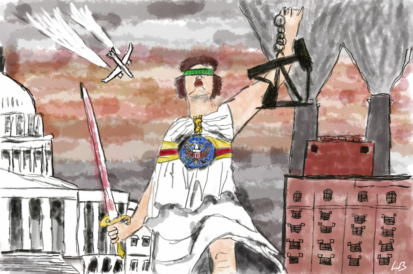 Description: The painting depicts Lady Justice in the center, blinded by wealth and money and holding up an oil pump instead of the scales of justice. She is flanked by a fossil fuel power plant, the Capitol Building, and a commercial airliner. My work was inspired by the presidential administration’s desire to remove environmental regulations in the service of the fossil fuel industry, hijacking the government bodies that are meant to ensure that everyone has equal access to a clean environment.