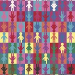 Description: Gender expression is the way an individual chooses to express themselves to the world around them, whether that is through their clothes, actions, mannerisms, etc. This pattern demonstrates all different types of people, whether or not the way they express their gender is in alignment with their identity or biological sex. A peaceful world is one where everyone receives equal space, respect, and freedom to present their gender however they wish to do so. As the viewer’s eye travels from the top of the pattern to the bottom, the symbols and colors become more expressive in efforts to stray away from our society’s stereotypical, heteronormative, and gender binary ideas. The very bottom row includes just some of the pride flags that represent different facets of the LGBTQIA+ community.