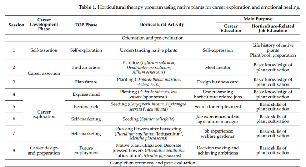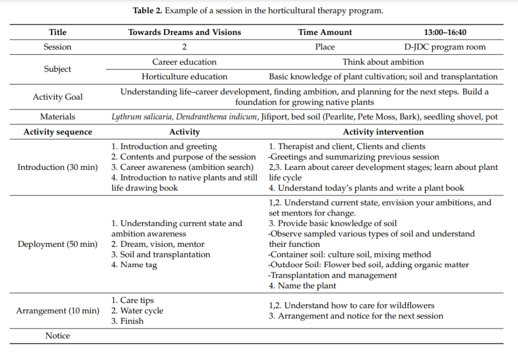 There is another program I found that is a horticultural therapy program to better youth’s overall health and wellbeing. Kim, Park, and Park created a study in which they developed a horticultural therapy program that is aimed to better the youth’s emotional stability and career exploration. Their findings conclude that a horticultural therapy program improved social skills and career exploration of the youth, and had a positive effect on their emotional stability and overall mental health. Creating options like this in juvenile detention centers would have a positive effect on the youth’s psychosocial development and directly helps them explore the idea of a functional world outside of juvenile incarceration.
