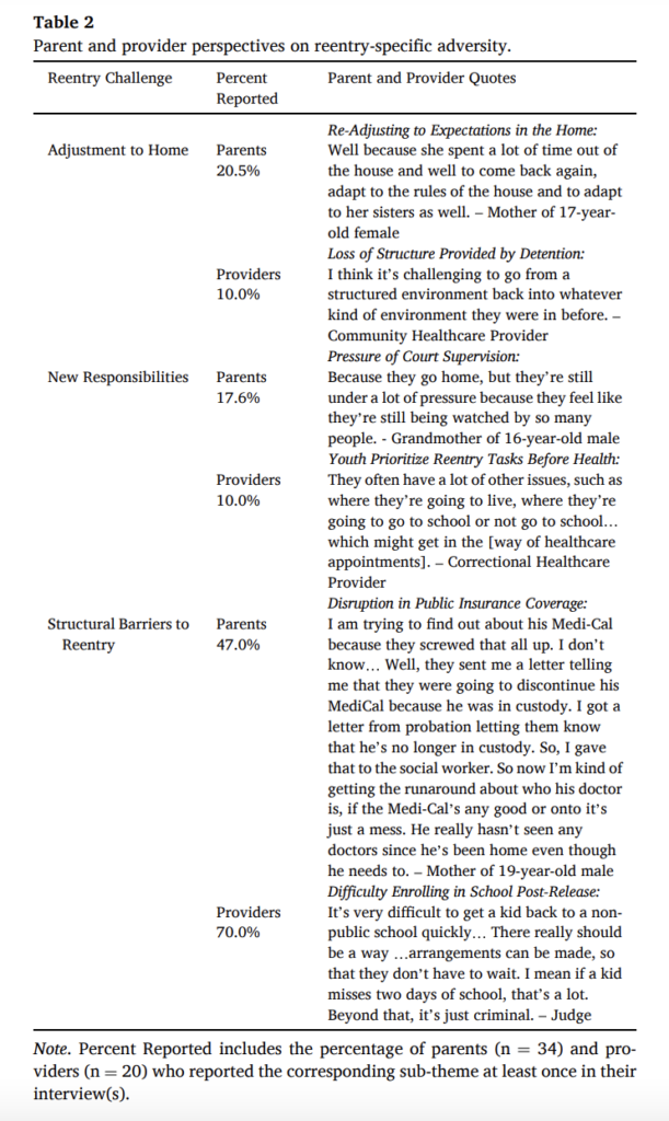 Bondoc et al. (2021). “Overlapping and intersecting challenges”: Parent and Provider perspectives on Youth Adversity During Community Reentry after Incarceration. Children and Youth Services Review, 125. https://doi.org/10.1016/j.childyouth.2021.106007
