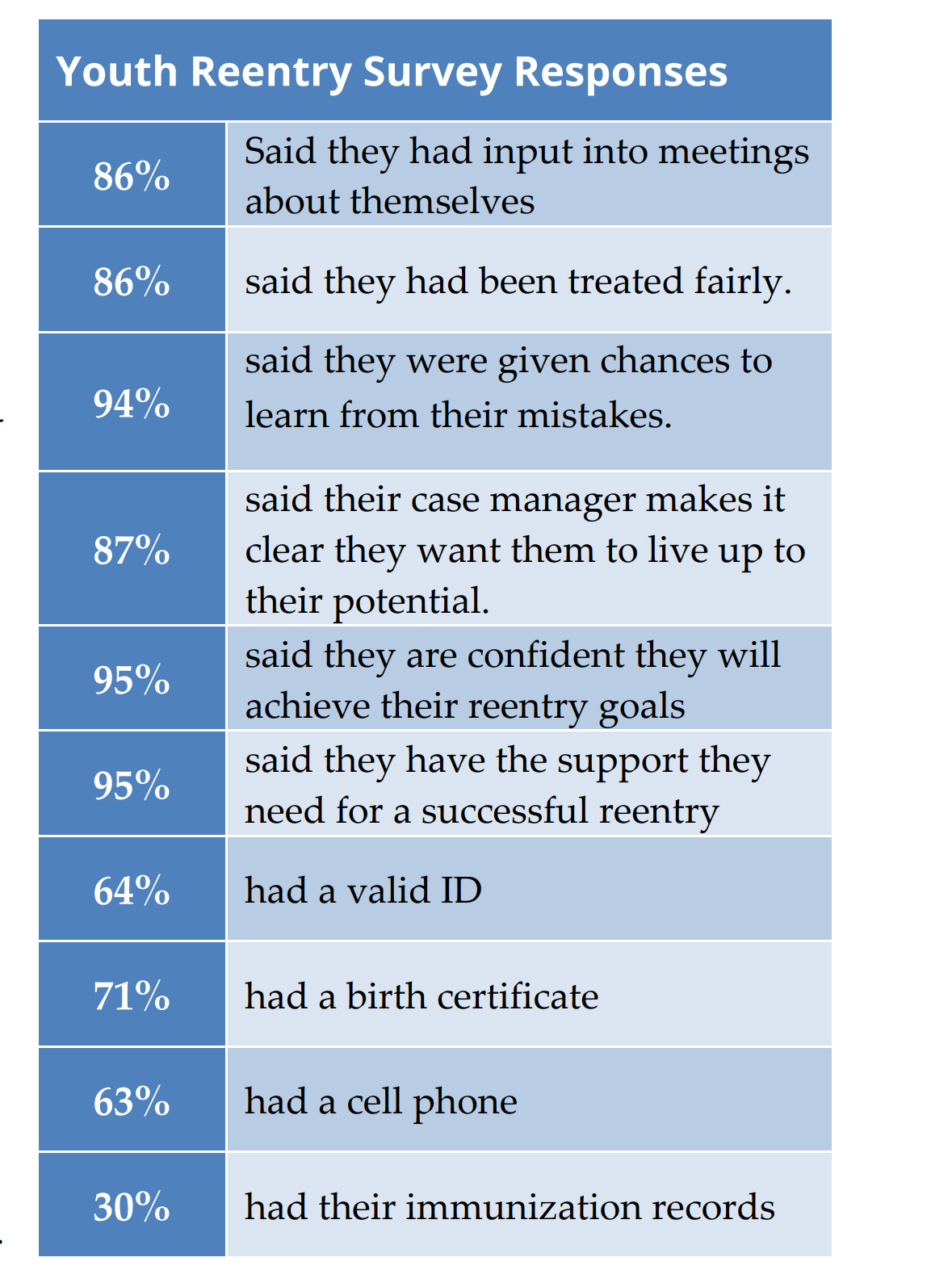 This survey administered by the federal Office of Juvenile Justice and Delinquency Prevention is demonstrative of what governments perceive to be important variables in the reentry process. The percentages themselves are far less interesting than the metrics used, particularly the first six statements. Not only are they quite slanted and leading in nature, but they speak to the hyper-individualized nature of the process, drawing attention to the character and goals of the juvenile rather than the services.