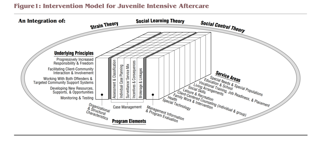 This report, published by the Office of Juvenile Justice and Delinquency Prevention, has long been the model for how youth reentry programs should operate. While the “underlying principles” and “service areas” in Figure 1 above speak to the idea of individual needs, the guiding principles of reentry programs (bullet points above) convey a much different message. They frame reentry as something that must be individualized to succeed. Further, principles 3 and 4 demonstrate quite clearly how government reentry programs can act as extensions of the carceral system. “A mix of intensive surveillance and services” and “a balance of incentives and graduated consequences coupled with the imposition of realistic, enforceable parole conditions” (OJJPD, 1994) demonstrate how the focus of government youth reentry is not about the services themselves but on creating a controlled and surveilled environment for the released youth to navigate.