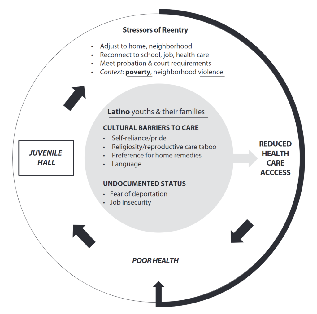 This figure from Barnert et al.’s 2020 research on Latino youths’ access to healthcare during reentry highlights how the juvenile justice system acts as a pollutant to that which is beyond it. The carceral threat of deportation, along with systemic issues like poverty, only worsen health care access for lower income, POC communities, which already have restricted access due to insurance barriers. Thus, the body becomes a site of possible pollution, as it cannot rely on consistent medical aid due to capitalist structures of the healthcare system which are perpetuated by carceral features (Barnert et al., 2020).