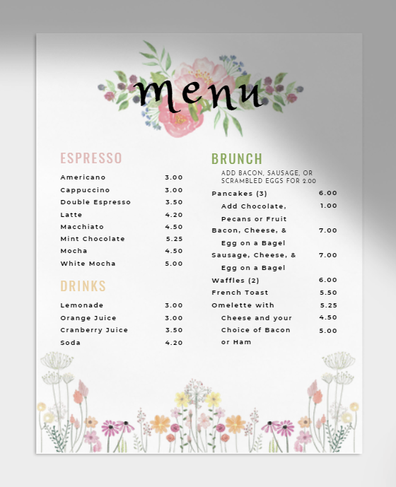 a cute, Spring menu offering a variety of brunch choices