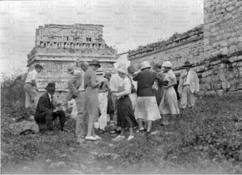 The photos catching my attention most- which all happened to be taken by Raúl Cámara Zavala- were of people at Chichén Itzá. These photos are of people who seem to be tourists, though it is unclear where they are from. My first assumption was that some of the people were from America, perhaps because I know many American tourists visit Chichén Itzá today. It was surprising to me that people would visit this place outside of archeological research almost 100 years ago (1925-1940). It brings into stark contrast how out of place people seem in a place with such history, in that they just look “off” in that environment.