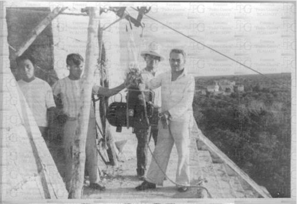 Portrait of four standing on the upper platform of the Temple of Kukulcán or Castle of Chichén Itzá, while carrying out tasks of raising or lowering lighting equipment. In the background it is possible to see the Caracol or Observatory and the House of the Nuns. (Raúl Cámara Zavala, Unknown date)