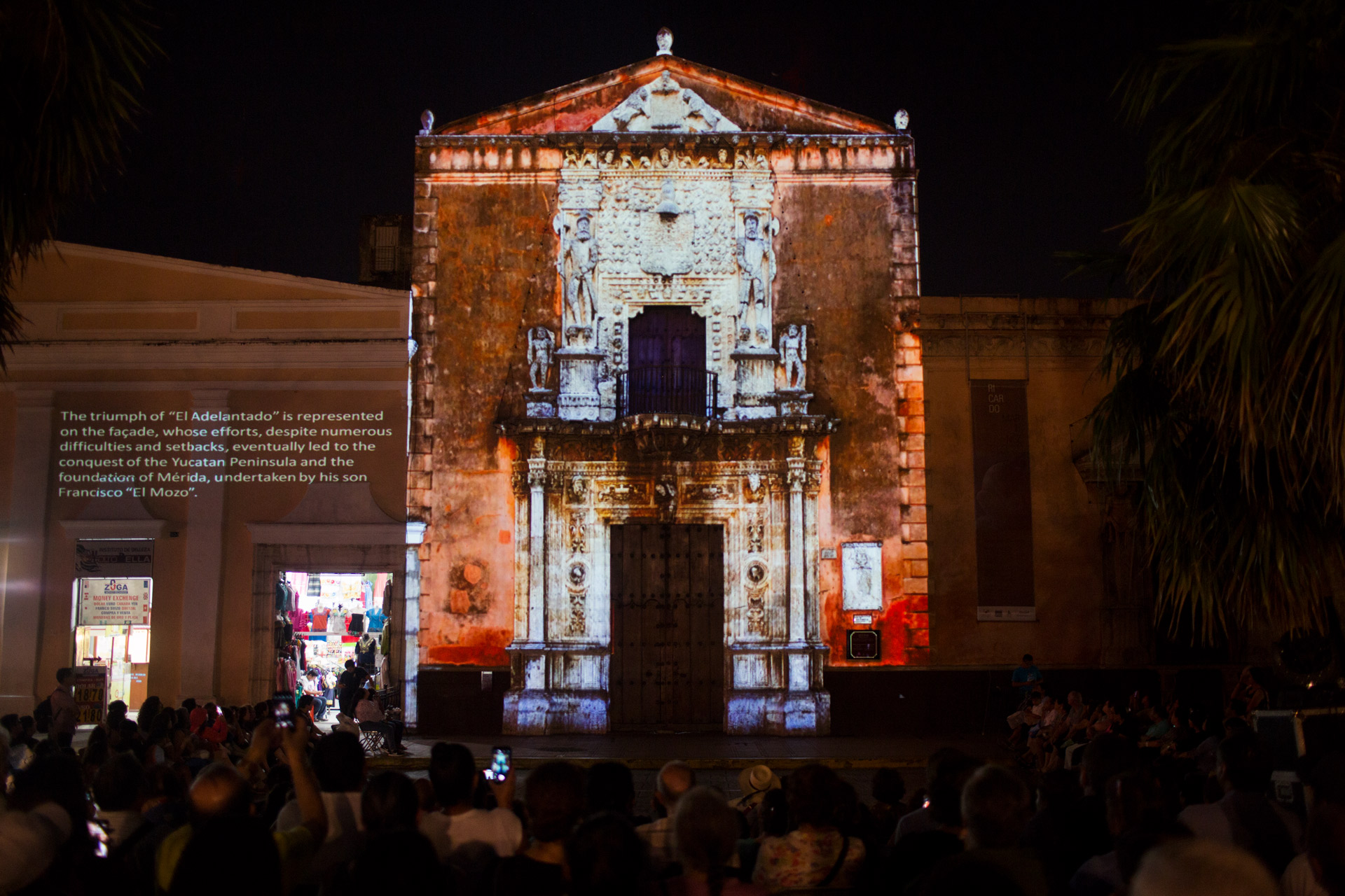 Starts at 8! Diálogos del Conquistador is a video mapping presentation that takes place at Casa Montejo. A (subtitled) interaction between Francisco de Montejo and a Maya leader.