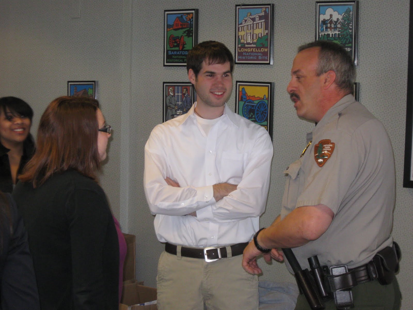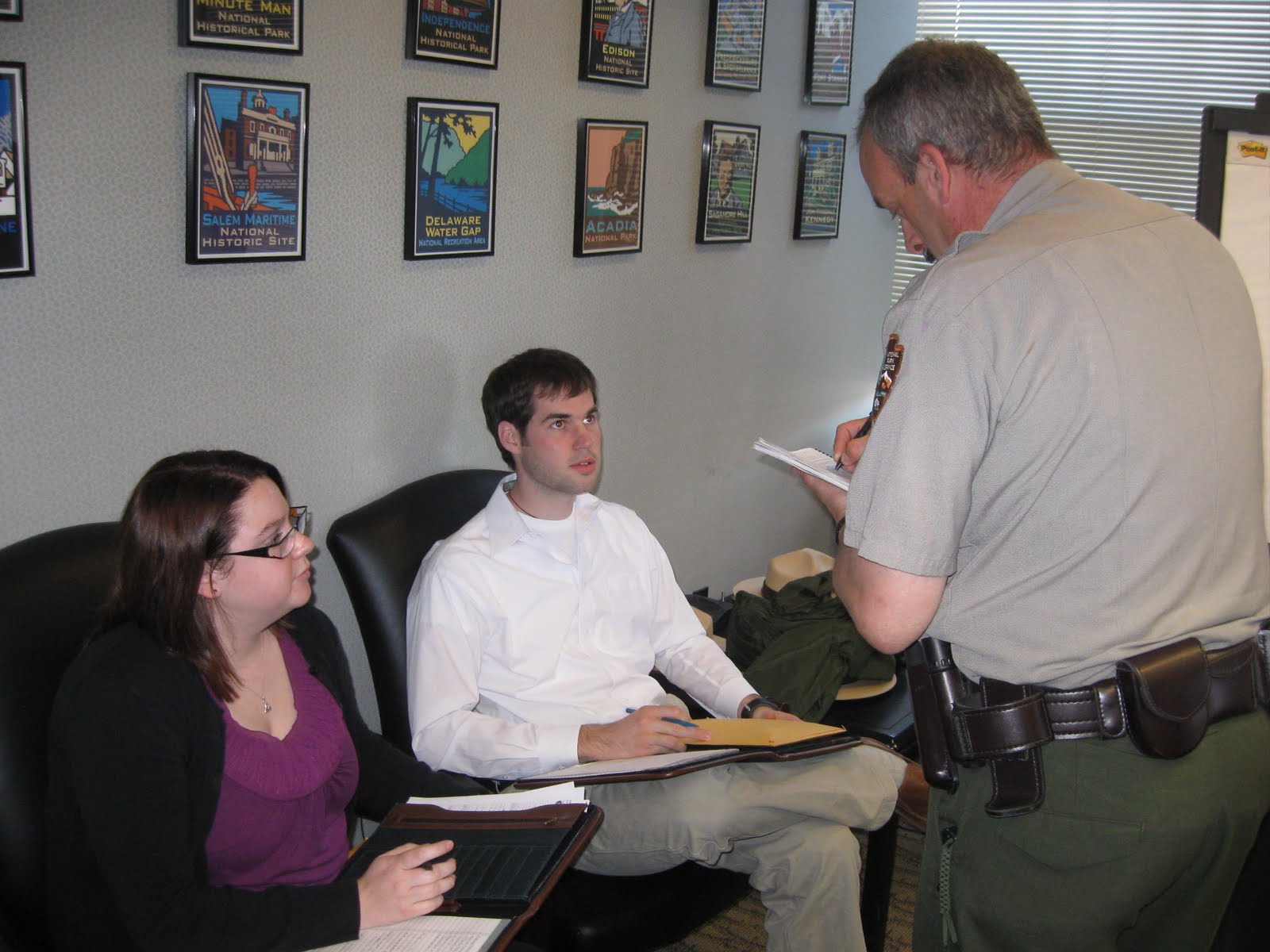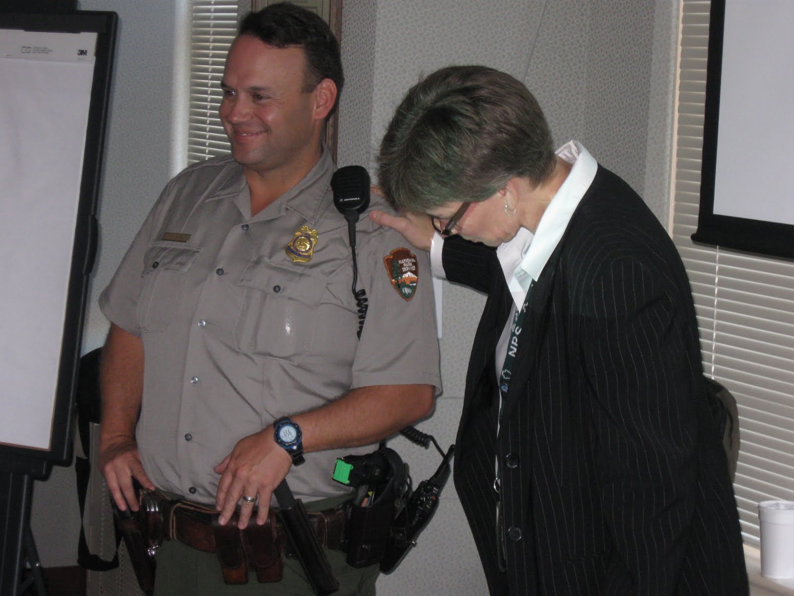 Northeast Regional Chief Ranger Jill Hawk asks Law Enforcement Park Ranger Glen Clark to demonstrate the proper wearing and attention to detail of the uniform.