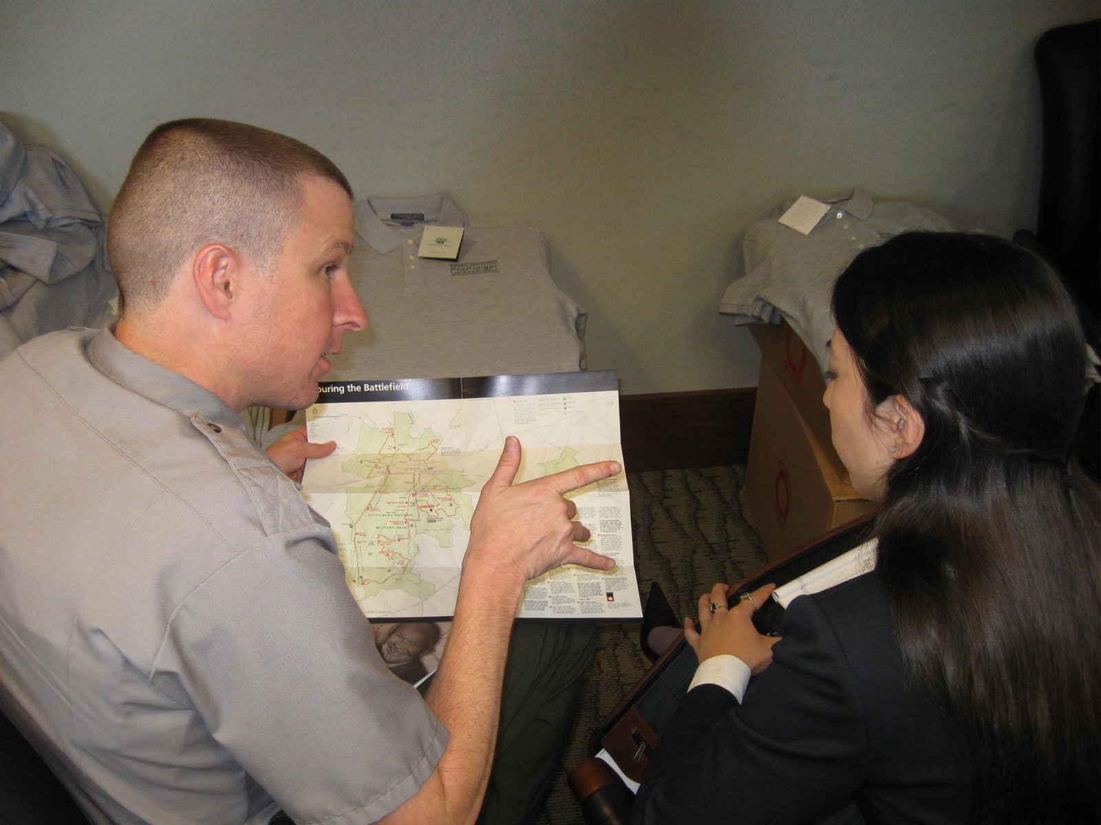 Supervisory Law Enforcement Park Ranger Ryan Levins shows Layla Schade a map outlining the historical features and boundaries of Gettysburg National Military Park.