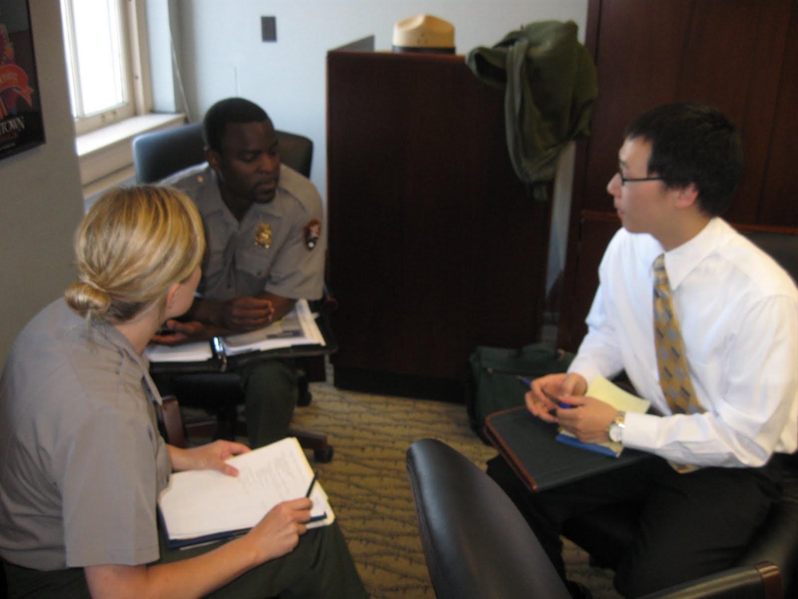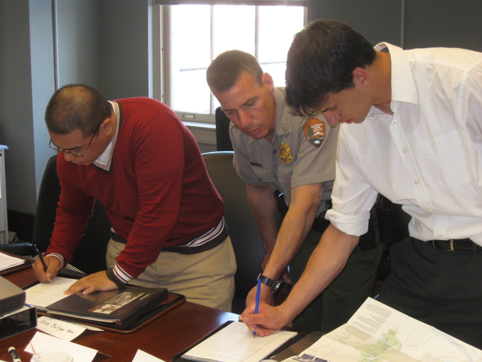 Supervisory Park Ranger Steven Williams and Park Ranger Shuni Routh exchange contact information with Timothy Oh.