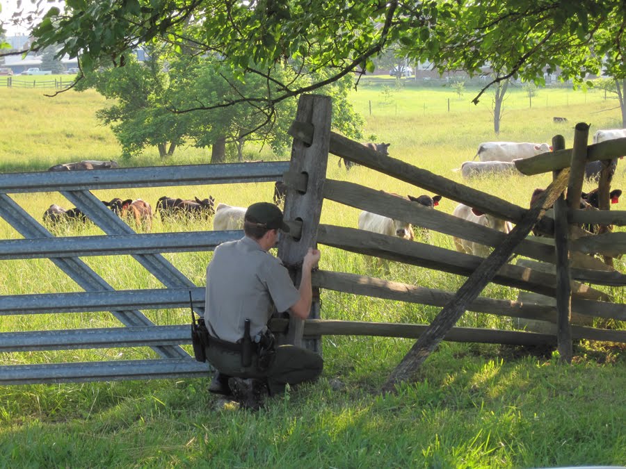 Once we get the cattle back to where they belong, search for and repair any fence damage, we usually notify the farmer. Until that point, however, getting the animal back where it belongs is our responsibility since it’s on park property.