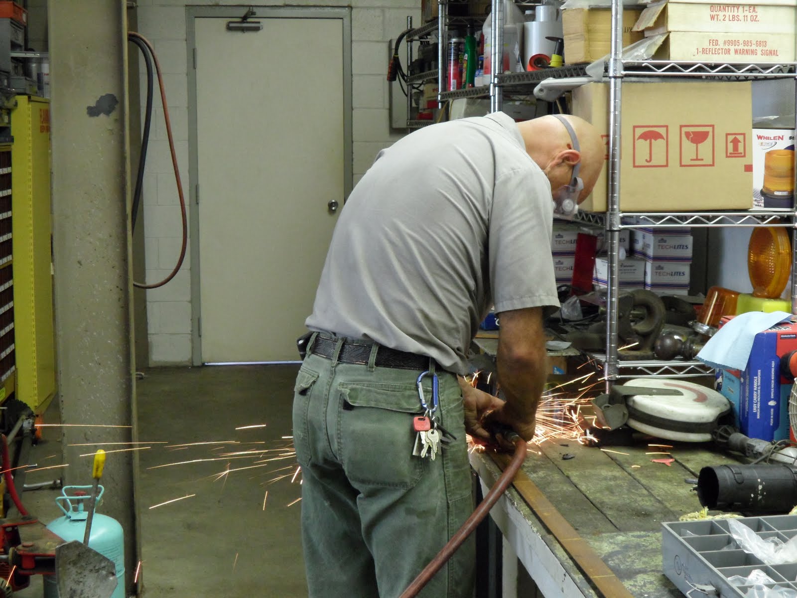 I spent a day with our electrician, Jeff, who takes on the daunting task of fixing almost anything with wiring. In the picture above Jeff is functioning a tool that will attach warning lights on riding mowers.