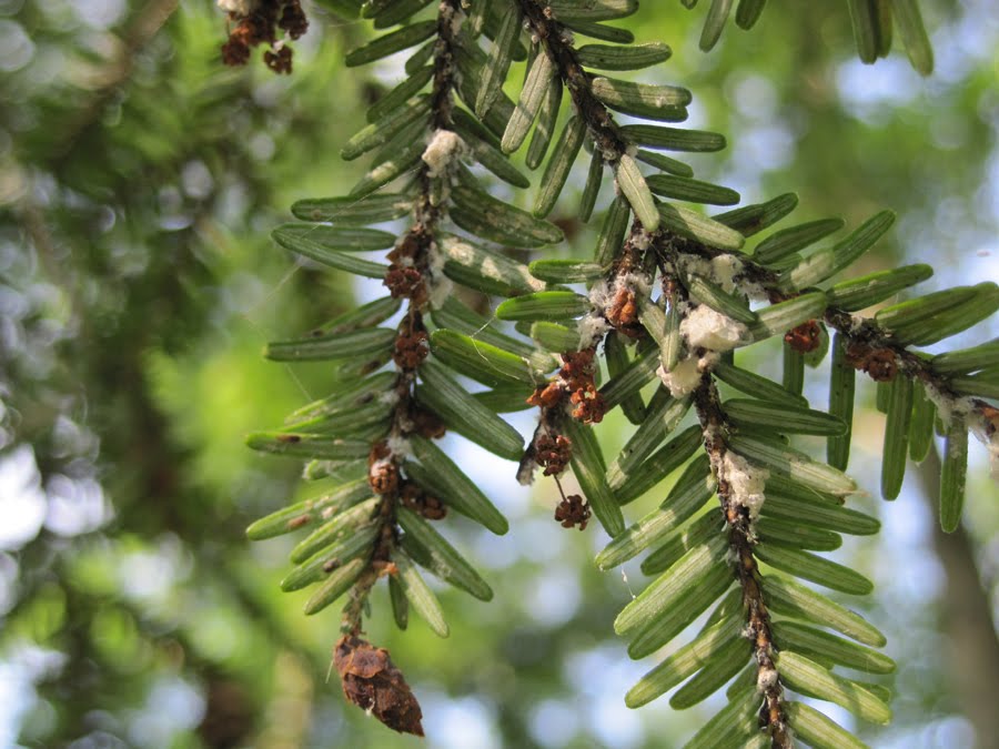 Hemlock woolly adelgid is a severe problem here in our park. Many of our cemetary’s hemlocks, as well as some of the trees near the old cyclorama building are currently infested with the sap-sucking insects. These cottony masses on the underside of the branches are full of eggs, which will one day mature into what Forestry Tech Randy described to me as “little crawlers” that will suck the sap from the tree’s needles. This causes defoliation of the tree, and if left untreated, will inevitably cause the tree to die.