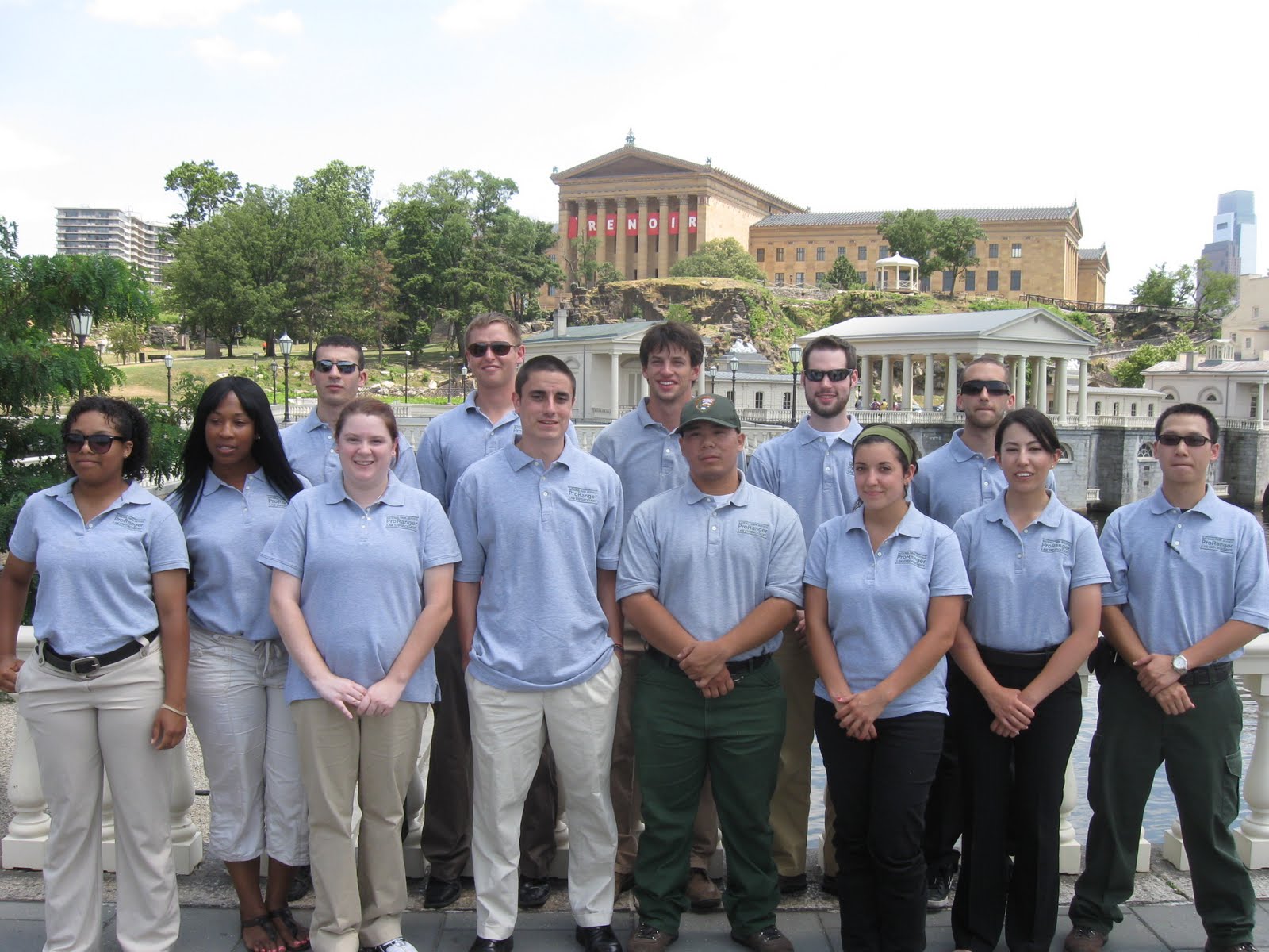 Members of the 2010 Cohort – Rosalia Fiorello, Alex Buligon, Travis Gerhardt, Keith DeFabio, Giancarlo Graziani, Owen McDaniel, Aaron Lyle, Michael Hanna, Timothy Oh, Kathryn Snyder, Layla Schade, Melissa Burch, and Lytia Solomon – pose at the Fairmount Water Works on June 29, 2010 during a field trip.