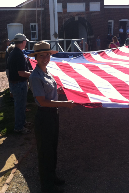 Hey everyone! Your parks sounds amazing! I just arrived at Fort McHenry on Sunday, May 22, so I’ve been here for four days now. I like it a lot! Fort McHenry is surrounded by water and is so pretty! Monday, we went to Fort Mead to the gun range for all the seasonals so they could get their gun qualifications. I got to call “Fire!” all the commands for them. Being semi-in charge was fun! Yesterday, I did the PEB test again and increased both my sit-and-reach and my bench press score. My sit-and-reach at Temple a couple weeks ago was a 22 3/4 and yesterday was 23 3/4. The bench press machine was slightly different and made a dramatic difference on my score. I went from 68 lbs a couple weeks ago to 105 lbs, practically my entire body weight! I feel like super woman! hehe Today and tomorrow we are doing our Operational Leadership training. Although it is a long process, Glen Clark has made it really interactive and interesting.