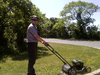 Ryan mowing the lawn while he poses for the camera.