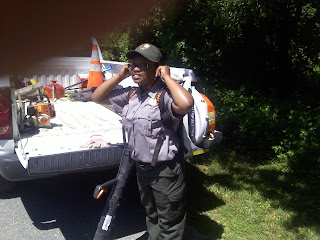 Here I am getting ready to use the blower to help clean up along the road.