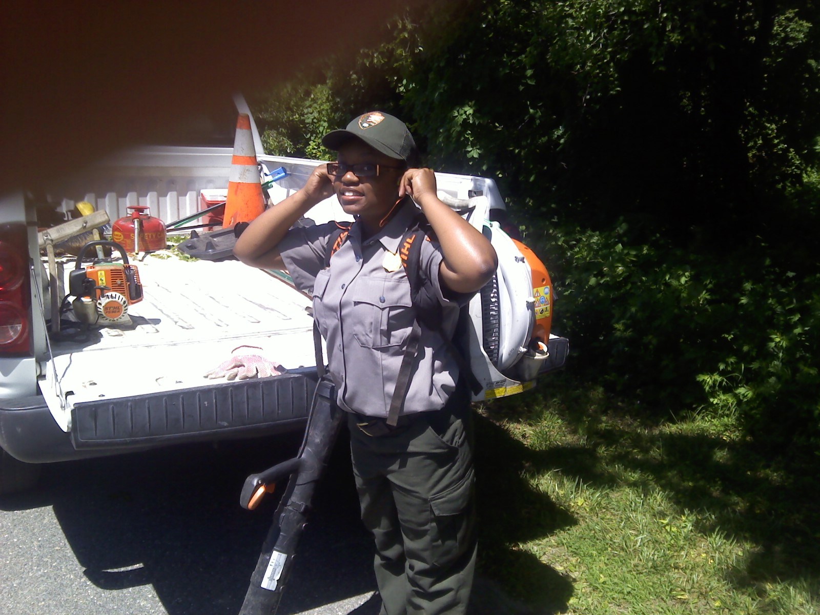 Here I am getting ready to use the blower to help clean up along the road.