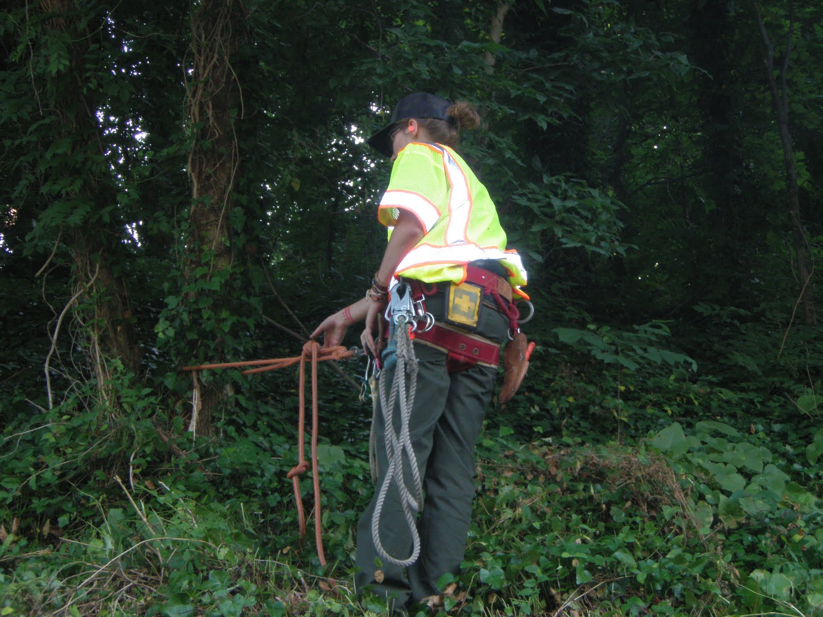 On Wednesday Tia and I worked with the Tree Crew. Working with the Tree Crew was so much fun. I was able to go about 65 to 70 feet in the air in the bucket, which was was scary but exhilarating. One Tree Crew member, Tim, showed Tia and myself how to safely climb and take down a hazardous tree. While we took a small break in the shade to try and escape from the extreme heat a little fawn climbed out of the woods. The fawn was calling for its mother and then proceeded to slowly walk towards me. I stuck out my hand and the fawn gave my hand a little lick and ran into the woods, realizing that I was indeed not its mother. This event made me think back to P.D. Eastman’s Are You My Mother?, a personal favorite.