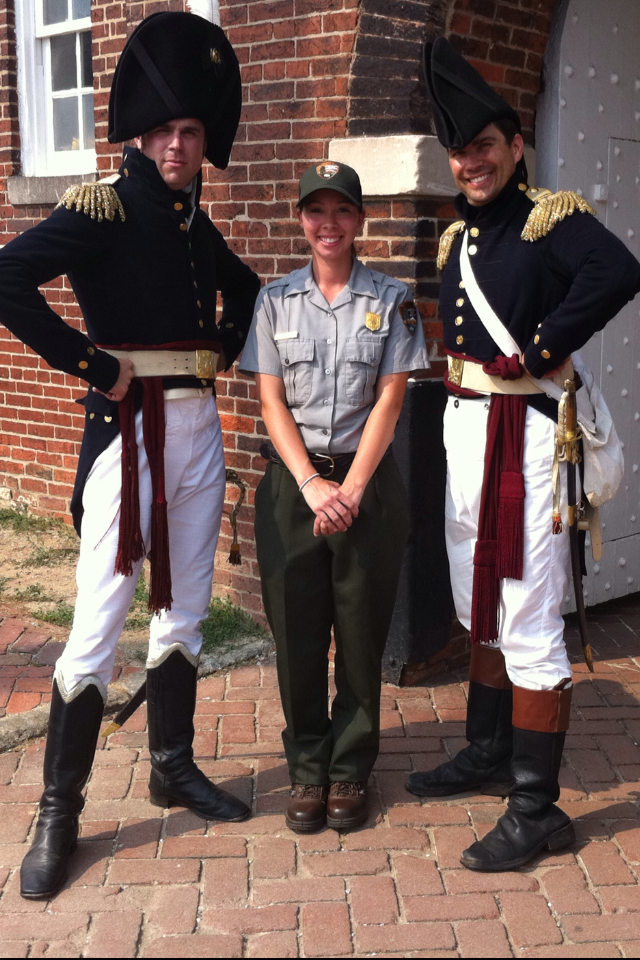 I learned that contact with visitors is an extremely important aspect of an interpreter’s daily routine. Interpreters, as well as any National Park Service employee, play a crucial role to the experience each visitor receives. Here at Fort Mchenry, the employees understand that our patriotic visitors travel far and wide from all aspects of the globe just to witness the birthplace of The Star Spangled Banner, our national anthem; therefore the employees pull to the interest of visitors and do all they can to ensure the visitors receive the most out of their trip to this inspiring national monument and national shrine. Interpreters dress in both their gray and green ranger uniform and in living history attire in order to ensure visitors receive the entire experience Fort Mchenry has to offer about the Battle of Baltimore. Contact with visitors in the two different uniforms sets a different tone to the experience the visitors take in.