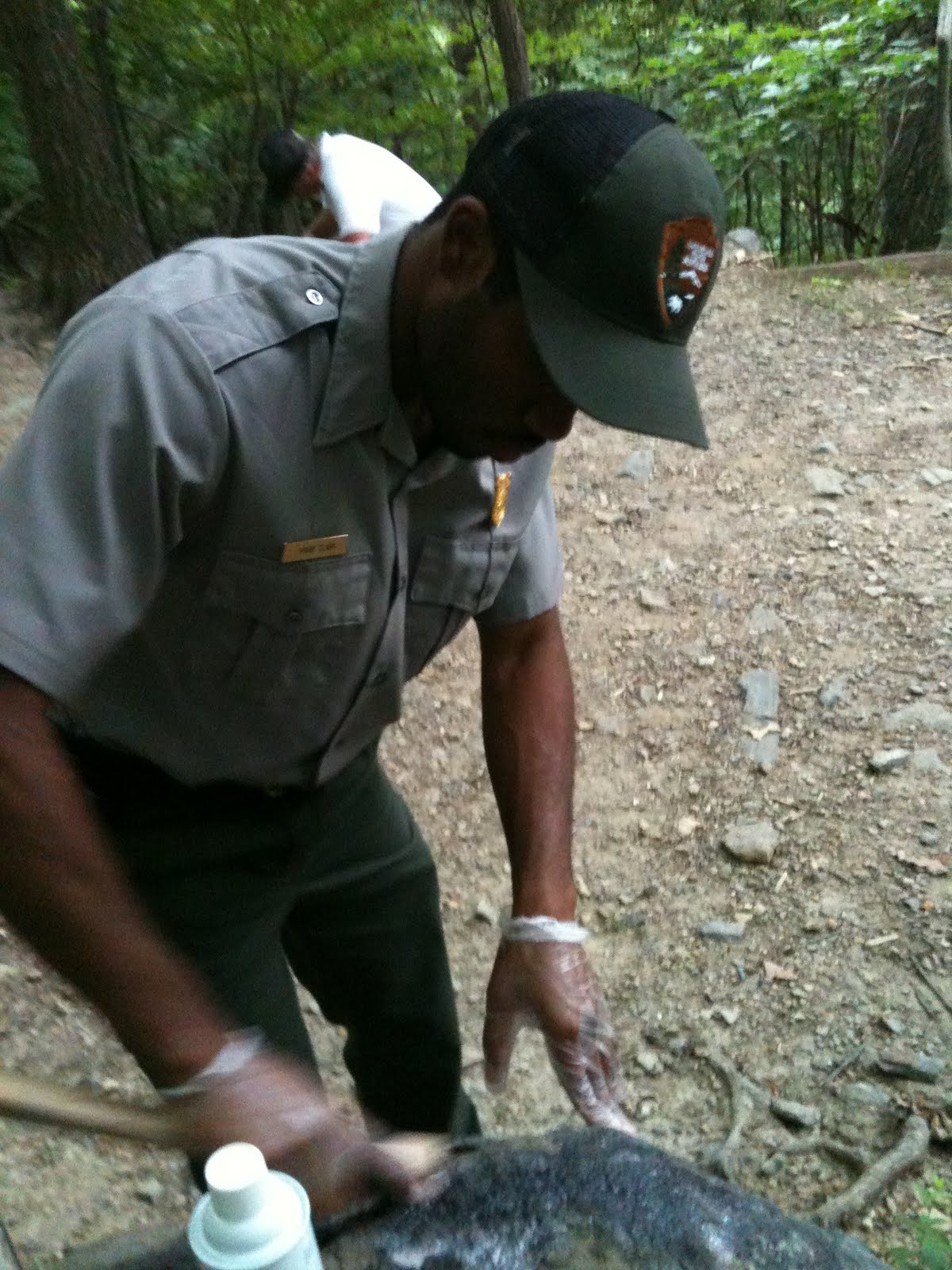 Wednesday marked our first day with the trails and grounds crew. To begin the day, I went out with the mowing crew to mow and weed eat along Shoreline Drive. Mark went along with the aborists to assist in pruning trees at the Ranger Station. Later in the day, we both returned to the Ranger Station to help chip the branches and limbs that were removed in the morning. Wednesday also included the monthly safety meeting at the Park. Mark and I attended the meeting and received an understanding of safety concerns in the Park and how they are being addressed.