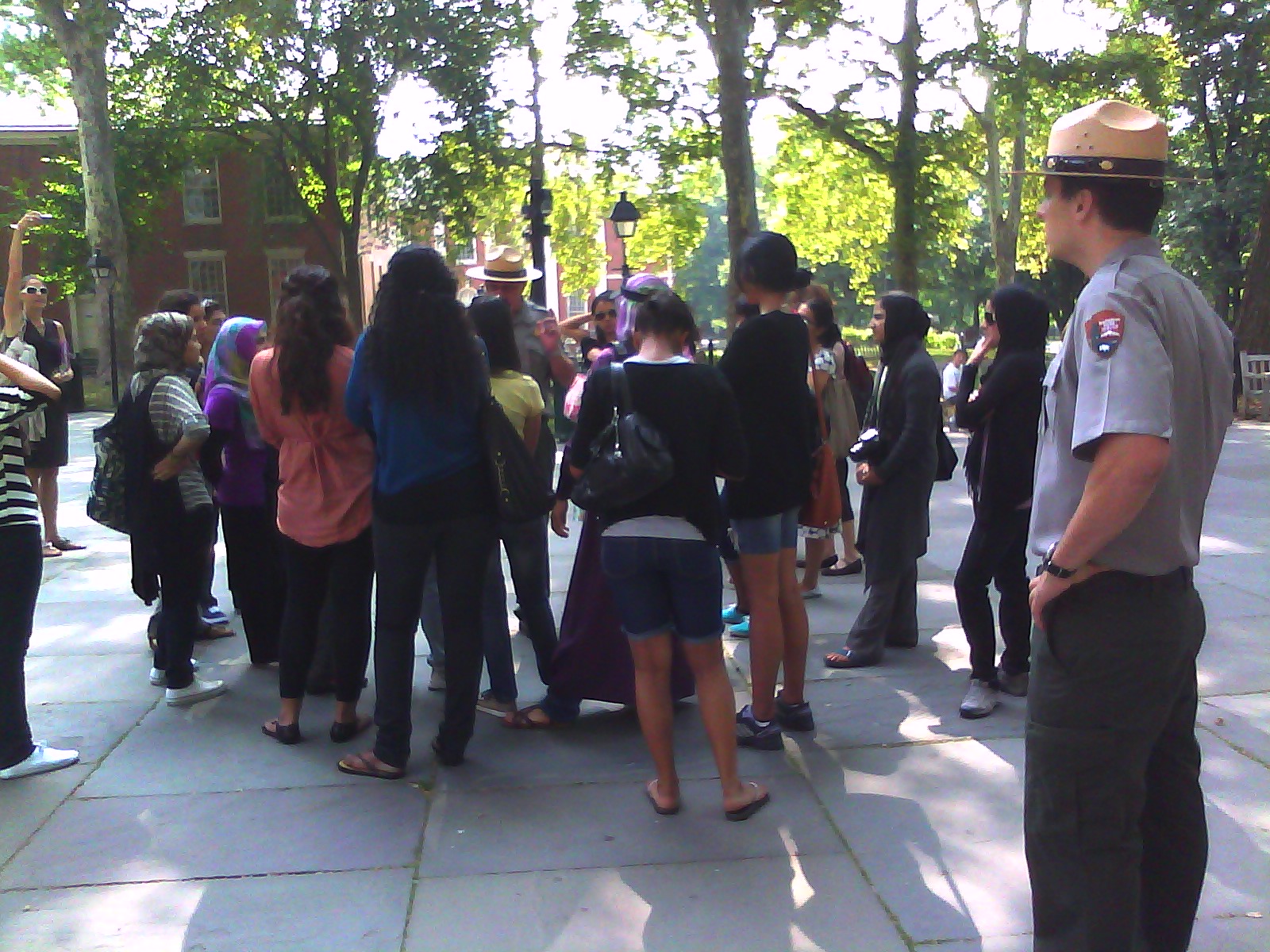 Hello everyone! Dan and I are having a great time in this heat here at INDE! We are staying hydrated and keeping in the shade when possible. Our first day back from our weekend was spent with Public Affairs. We were able to see how they scheduled events at the park. On Tuesday we were able to be a part of a private tour. This group of girls was from the Middle East but came to America for a Leadership program. Dan and I helped Frank Eidmann bring these girls around the park. We were able to see what kinds of groups are able to schedule private tours. We also were able to see the permits that get approved. The permits can be for film crews , wedding pictures or first amendment demonstrators. It was really neat to see how they ran their opperation! I was a part of one of their projects during Freedom Week. They received an e-mail with directions, (We want to show diversity in our staff and diversity in our places. Mostimages will feature one employee, but they could feature two, or anemployee with a visitor. We also hope to obtain short quotes attributableto these employees. Such quotes would be about their feelings for theirpark, their work, the future of the NPS, etc. Quotes could express ideasabout the Centennial, education, professional excellence, stewardship,leadership, or any other aspect of the N