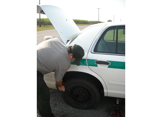 (Jim searching a patch of trees and undergrowth next to the planted cornfield for the wayward puppy)Friday was by far our busiest day. While planning out our tour route for our interp talk Cailin and I got a flat tire. We only bring this up since we also got a flat tire with the same vehicle at Manassas a few days earlier.