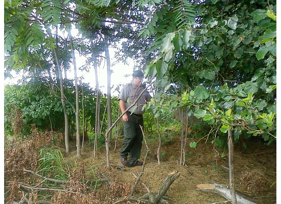(Jim searching a patch of trees and undergrowth next to the planted cornfield for the wayward puppy)