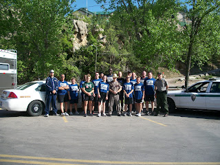 My first day at work was just as exciting! Two men from Game, Fish, and Parks were coming to the park to check on a Big Horn sheep that they were tracking. They believed that she was going to be giving birth and wanted to hike up to find and collar the lamb. Typically, Big Horn sheep do not frequent this part of the Black Hills however this specific sheep gave birth here last year. Her sudden movement back to this area is what tipped them off that she was giving birth again. Rob Webb, another ranger, and I accompanied them up a trail into the back country of the park. It was a beautiful hike filled with amazing views all the way to the peak of the mountain (located behind the Memorial). We were finally able to locate the mother sheep and her lamb. The mother sheep was spooked by our arrival and had bounded past us on the huge boulders. We were able to find the lamb and weigh and give him some immunization shots. The Game and Fish men also put a tracking collar on him so they could track his further movements and make sure he survived the next 6 to 8 hours. It was amazing to see this animal so close in the wild and was a great start to my summer!The group shot in Keystone after we completed the run.