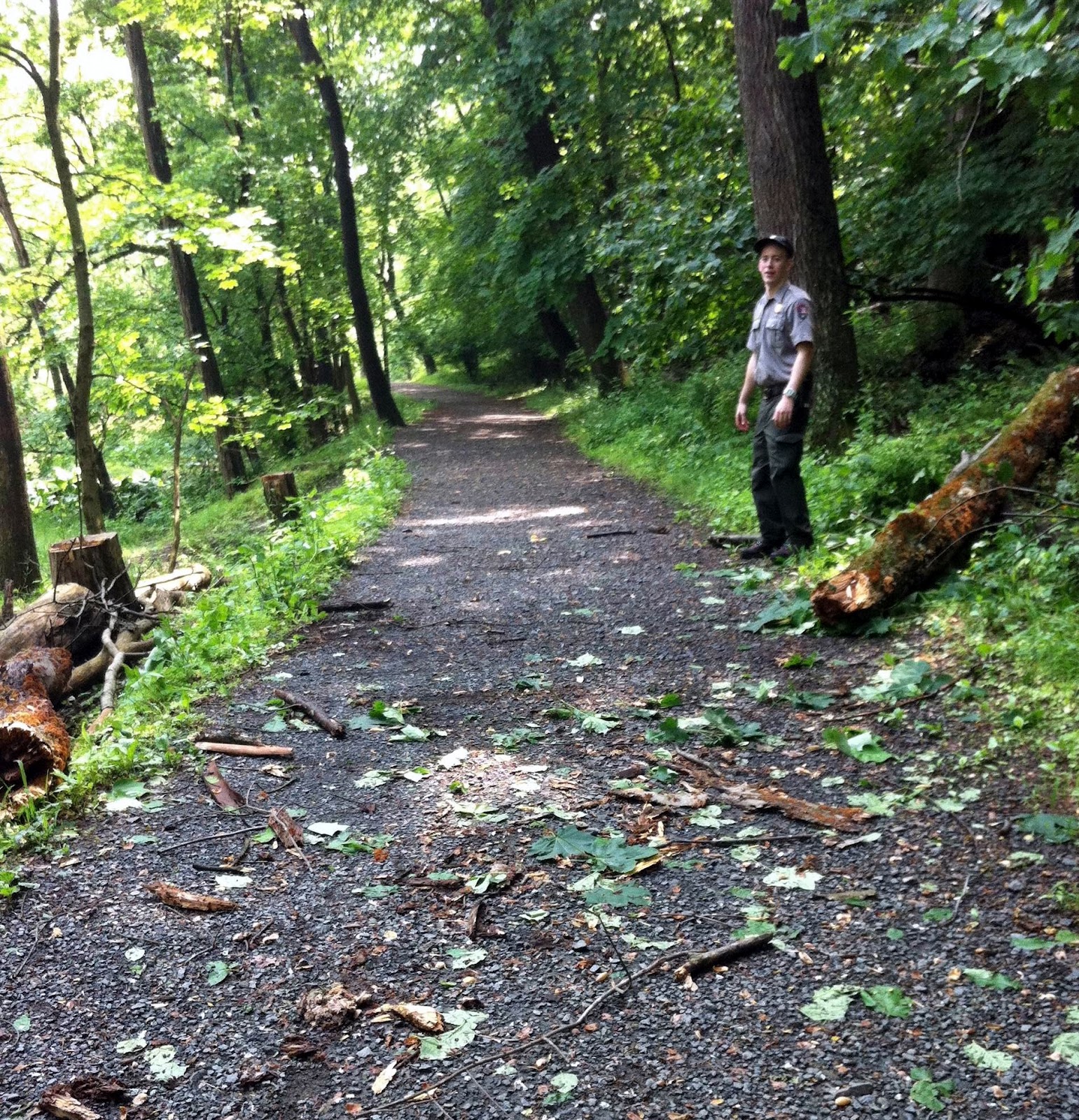 Hello Everyone! It has been an exciting first week here at Valley Forge. Lexus Ocampo and I, Eric Morgan, are both stationed here and will be doing the first blog entry separate to share our experiences during the first week and will probably be posting together during the rest of the summer as most of what we will be doing will be done together. So to get started we moved in this past Monday, the 14Th, and began our work week on Tuesday meeting at the Ranger Station with Chief Ranger Greg Tinkum. The first thing we did was to go with Administration, Lisa Waterman, down to Delaware to pick up a couple of GSA vehicles. One has become our work vehicle which is a very nice Ford F-150 which will be seen in some of the pictures I post. During the afternoon Chief Tinkum drove us around the entire park, explaining the roads, sites, and things to look out for. This week has been about learning the park and knowing where everything is so that if we need to call in an incident or accident we know exactly where we are. Wednesday we began hiking patrols as there are a lot of trails here at Valley Forge. We are to be the eyes and ears of the Rangers while on patrol and were given radios if we needed to call anything in. In the morning we patrolled the Valley Creek Trail, Horseshoe Trail, and Mt. Misery Trail, yes its name rings true. This took all morning as it was constantly up and downhill but every hiker we came across was glad to see us up there. In the afternoon we patrolled the other mountain trail which is Mt. Joy. These trails are beautiful and filled with wildlife (saw some foxes for this first time). Horses, bikes, and pedestrians are allowed on most trails so it is important to make sure no one is disturbing the wildlife, nature, or the enjoyment of the recreational users and visitors to the park so as to keep up with the NPS’s mission. After our second patrol we were issued government cell phones to keep in contact with our co-workers and access codes which are very important to be able to enter certain buildings. Thursday was another LE day and in the morning, after being give Ranger Stations keys, we patrolled the Chapel Trail which runs along the Schuylkill River and leads to Washington Headquarters. This is one of the longer trails at the park and on the return route we patrolled a smaller trail that ran right next to the river. This trail is very popular for mountain bikers so it is also necessary to be patrolled. Plus it gives a great view of what is going on on the river. The entire morning patrol came out to be about a 6 mile patrol. It is also important to mention we were given radios that all Valley Forge Rangers would be listen to in case we came across a situation we needed to report. After lunch we were asked to be apart of a role-playing scenario for a Seasonal Law Enforcement Ranger who needed to be commissioned so we went along with Rangers Nate, Mike, and Gordon. Lexus and myself were pulled over by the Seasonal Ranger Erik for numerous reasons in different scenarios so the other Rangers could see how and what he does during traffic stops. Things such as having a firearm (plastic of course for safety) in the vehicle leading to a vehicle search and taking park resources were some scenarios. I ended up being handcuffed and searched in the taking of the park resources scenario because my role was to have a warrant out for my arrest so they wanted to see how Erik handled the situation and if he did everything properly and let me tell you that it is not fun being handcuffed so stay out of them…as we all should!. It was a great experience that we got to take a lot away from. By being role players we learned when approaching a vehicle to tag the tail light, where to stand when talking to a driver, always try to have your gun hand free, and where to place an individual when searching their vehicle. Today was another LE day where we had to go through about 15,000 photos from a covert camera that would take snapshots of passing movement in a section of the park. The purpose was to help the Rangers go through the photos and see if any of three suspects’ cars showed up that have been involved in breaking into vehicles in numerous parks for some time right now. We had no luck as the vehicles were not in any of the photos. Late in the day we did a bike patrol with Chief Ranger Gregg throughout the park. I enjoyed the bike patrol much more than hiking and am looking forward to more of them. Tomorrow we will be patrolling the North side of the park’s trails which is across the Schuylkill River. Next week we will be sent to Maintenance for a couple of days and are either going to Independence or Hopewell Furnace for interpretation. We also found out that we will be down at Fort McHenry for two days to help with the Bicentennial of the War of 1812 which should be a very rewarding experience. I am ready for whatever comes our way this summer and will take from it as much as possible. Until next time guys, be safe and enjoy! Keep up on the PT!