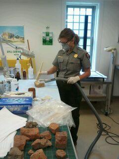 On our last work day of the week, Erik and I headed out to Jamestown to meet with the Museum Specialst and Conservator. Here we were able to witness Jamestown’s long history with an endless array of old and historic artifacts. She allowed us to work with some of these artifacts in her lab. We treated some pieces of 17th and 18th century brick that was found. These bricks needed a lot of work so we first cleaned them off and then we sorted them and labelled the collections. Many of the bricks had old pieces of glass and shell in them as well. I really enjoyed working with the artifacts as it reminded me of working in the science labs back at school with all the different tools and techniques.